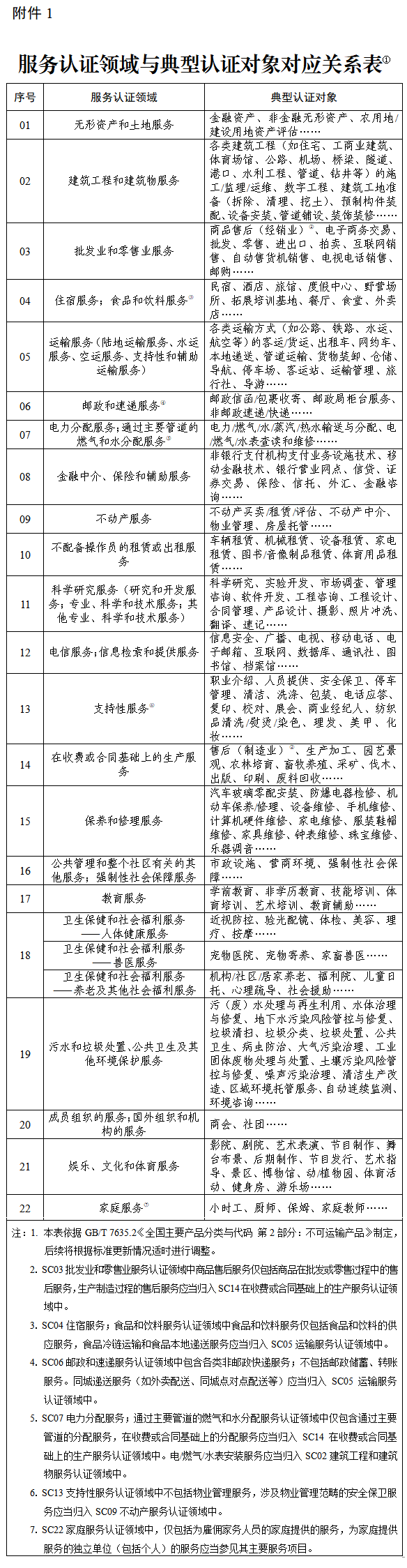 认证机构应当结合市场需求和自身能力,识别服务特性,依据GB/T 7635.2《全国主要产品分类与代码 第2部分:不可运输产品》,参照《服务认证领域与典型认证对象对应关系表》(附件1),界定服务认证对象,确定服务认证领域。